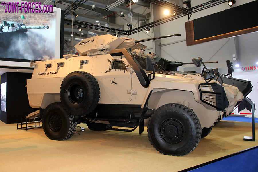 The COBRA II Mine-resistant Ambush Protected Vehicle (COBRA II MRAP) is displayed with 25 mm RCWS at WDS. Cobra II MRAP is developed to ensure high survivability in risky areas. The vehicle provides superior protection for the crew against kinetic energy, mine and IED threats while maintaining high cross-country mobility in battlefield conditions with its independent suspension system. High reliability, ease of maintenance are the other two important design criteria.