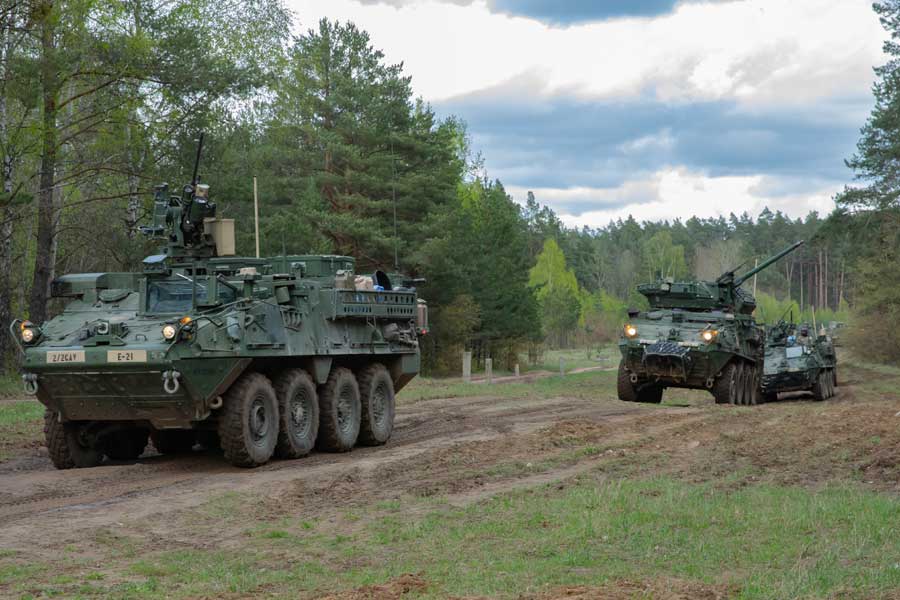2nd Squadron, 2CR, Stryker armoured fighting vehicles stage for a team dismount during CALFX on SABER STRIKE 24, April 16, 2024 [US Army Photo: Sgt Omar Joseph Sr]