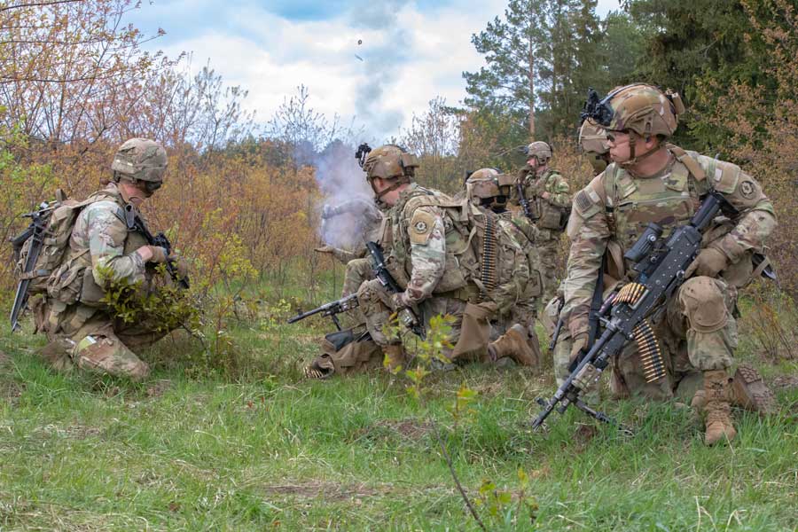 US Soldiers assigned to Eagle Troop, 2nd Squadron, 2nd Cavalry Regiment, pull security during a CALFX)at Bemowo Piskie Training Ground, Poland, April 16, 2024 [US Army Photo: Sgt Gianna Elle Sulger]