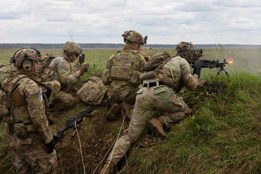 US Soldiers assigned to the Eagle Troop, 2nd Squadron, 2CR shoot an M249 light machine gun during a CALFX on SABER STRIKE 24, April 16, 2024 [US Army Photo: Sgt Gianna Elle Sulger]