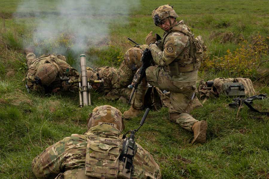 US Soldiers assigned to the Eagle Troop, 2nd Squadron, 2CR, hit targets with 120mm [sic] mortars during a CALFX, April 16, 2024 [US Army Photo: Sgt Gianna Elle Sulger]