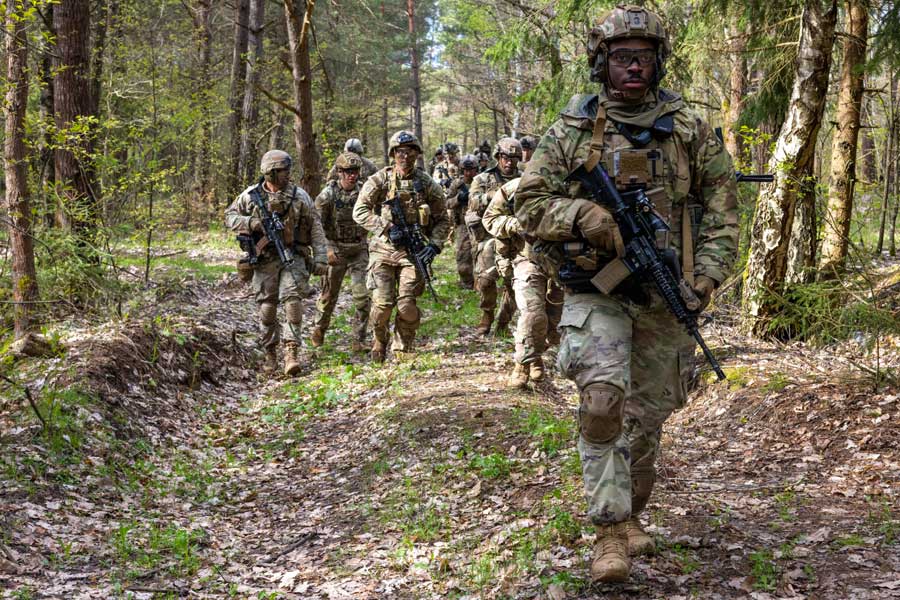 US Soldiers assigned to Eagle Troop, 2nd Squadron, 2CR, walk to the range during the CALFX at Bemowo Piskie Training Ground, April 16 [US Army Photo: Sgt Gianna Elle Sulger]