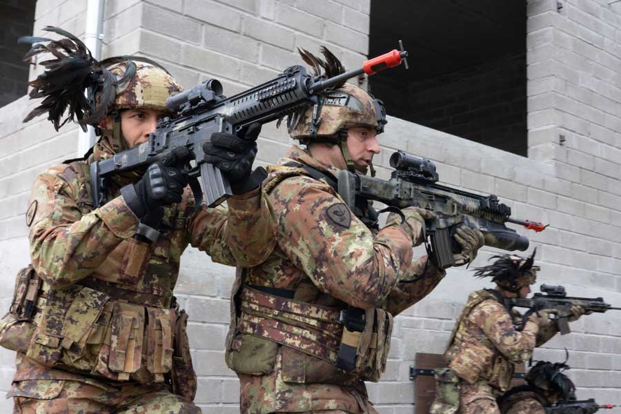 Italian Army soldiers assigned to 8th Bersaglieri Regiment participate in urban combat exercises on SABER STRIKE 24 at Bemowo Piskie Training Ground, April 15 [US Army Photo: Spc Andrew Clark]