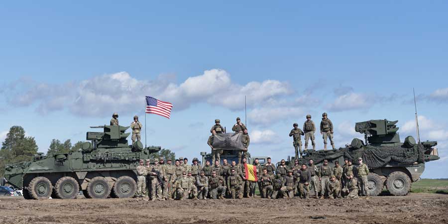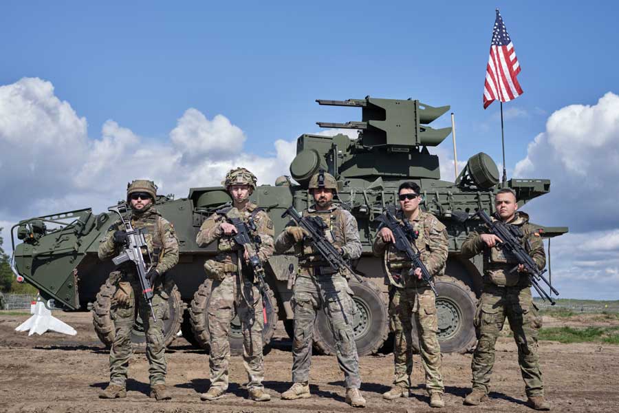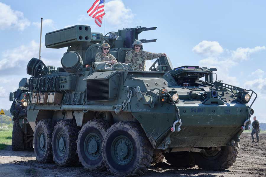 An M-SHORAD Stryker assigned to 5-4 ADAR , SABER STRIKE, 19 April 2024 [US Army: SSgt Robert Wormley]