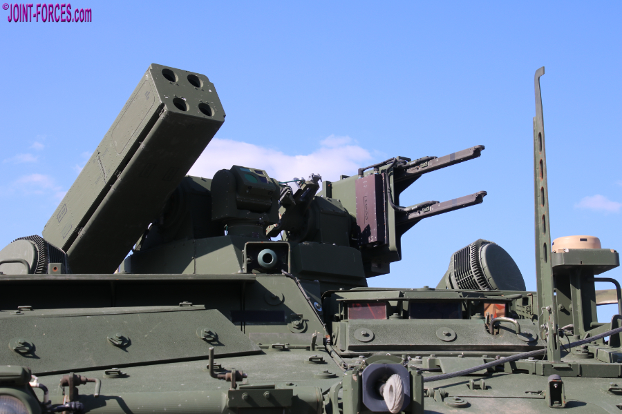 The primary 5-4 ADAR anti-aircraft and anti-UAV system is the M-SHORAD (Maneuver Short Range Air Defence) variant of the Stryker 8×8 armoured fighting vehicle. Normally these vehicles are configured with a four-round Stinger missile pod and a twin Hellfire missile launcher rack either side of the turret, which can also accommodate a 30mm XM914 cannon and 7.62mm coaxial machine gun, but neither missiles nor guns appear to be fitted in the accompanying photos. The Spanish vehicles are armoured URO VAMTACs.
