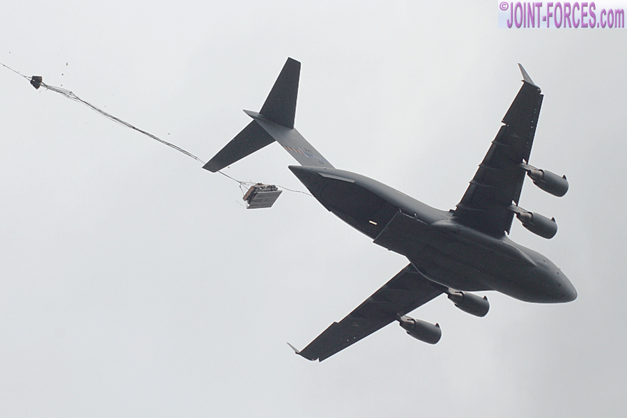 Library image from SWIFT RESPONSE 2017 of a US C-17 carrying out a daytime heavy drop of US Airborne vehicles [© Bob Morrison]