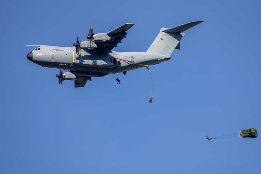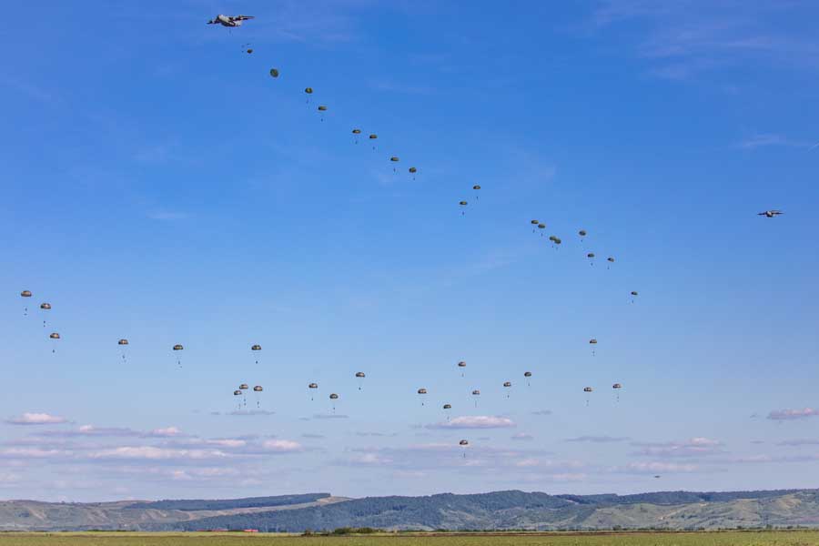 SWIFT RESPONSE 2024 exercise participants parachute from German A400M aircraft during a Joint Forcible Entry operation, 71st Air Base near Turda, Romania, May 13, 2024 [US Army: SSgt. Ashley Low]