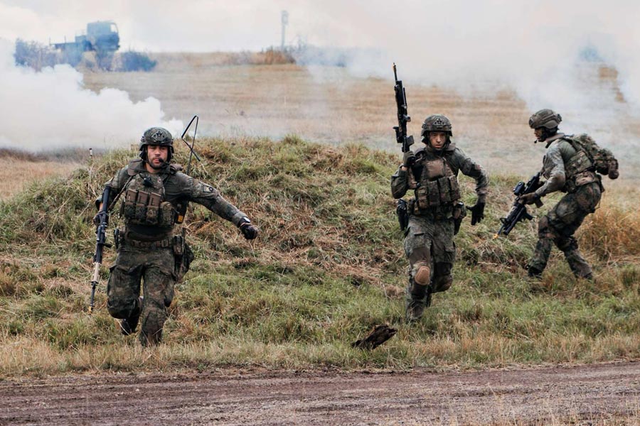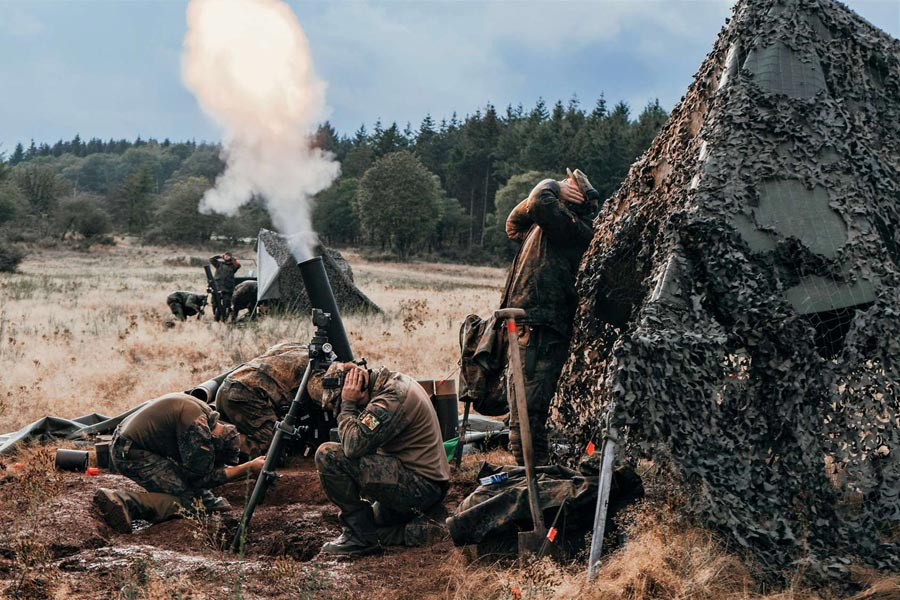 The international spectators look on excitedly at the Baumholder military training area in front of them. A speaker points out the exercise sequence that is about to follow. Suddenly there is a bang. Smoke and dust rise at a distance of several hundred metres. Further impacts follow one after the other and land precisely in the target area. The artillery fire gives the combat troops deployed at the front the opportunity to evade, in other words to distance themselves, from the enemy.