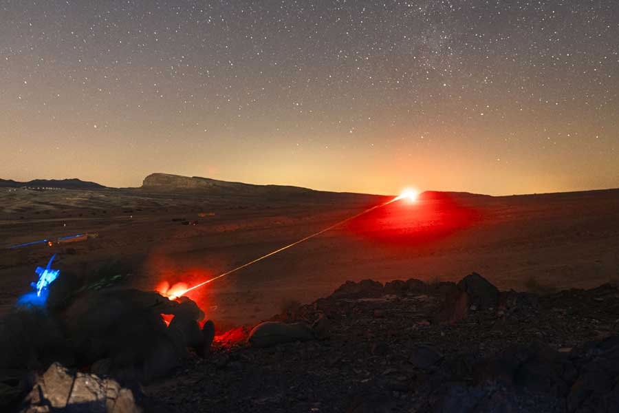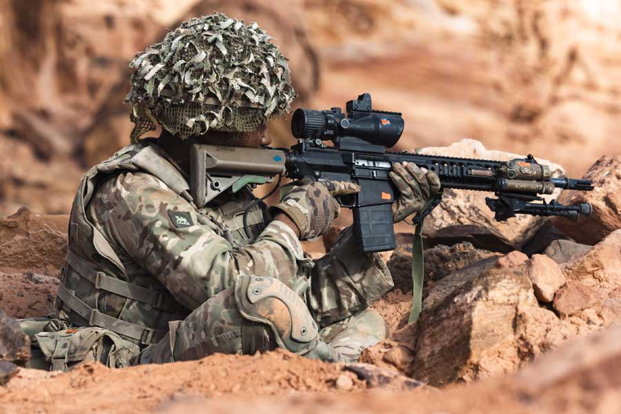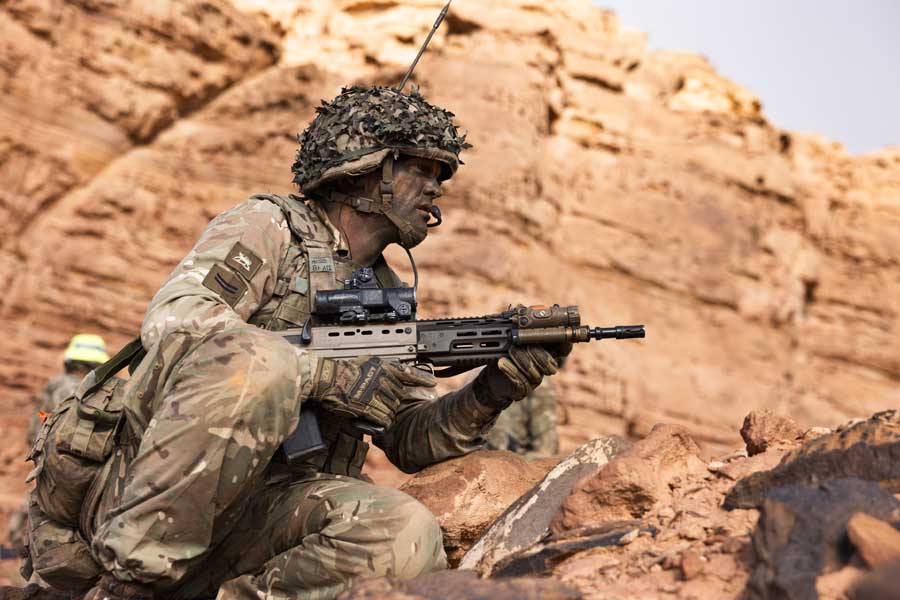 The initial live fire training phase culminated in an imaginative and innovative company 36-hour live fire exercise bringing all the skills trained into a realistic and demanding scenario built on the lessons of contemporary global conflicts. This included casualty evacuations, attacks at night and patrolling along undulating desert scrub containing wadis and rocky outcrops, with peaks of over 1100m. This training ensured the validation to high-end warfighting capability was achieved before the bilateral training between the PWRR and their persistent partner, the KHB.