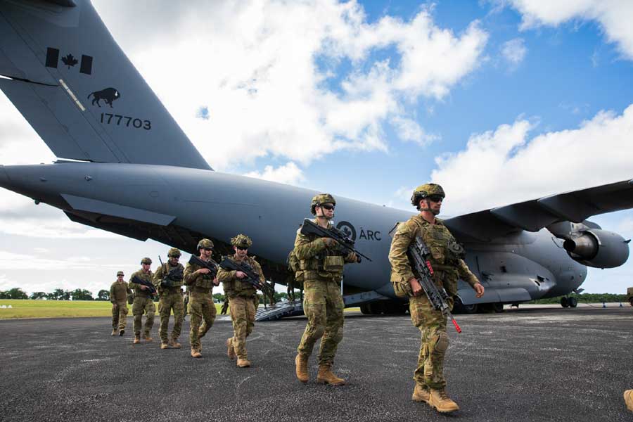Australian Army soldiers exit a Royal Canadian Air Force C-17A Globemaster III on Christmas Island as part of Ex. TALISMAN SABRE 2025 [© ADoD: FlgOff Michael Thomas]