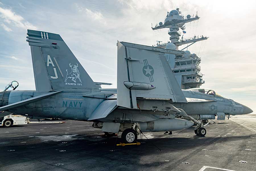 - 01:20 ~ US Navy F/A-18 Super Hornets fly past the USS Gerald R. Ford