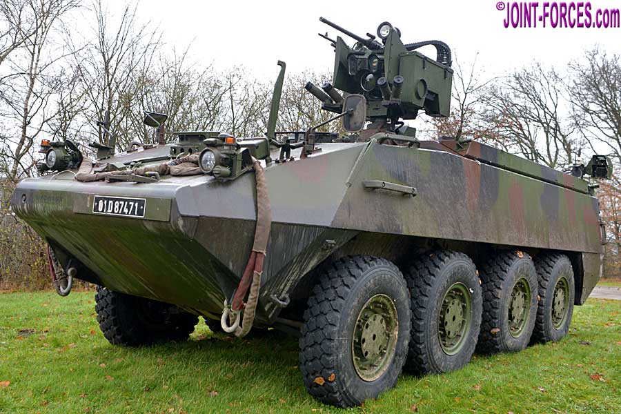Piranha IIIH: Protected mobility for the company is provided in form of several General Dynamics European Land Systems (formerly MOWAG) Piranha IIIH 8×8 wheeled armoured personnel carriers (APC).