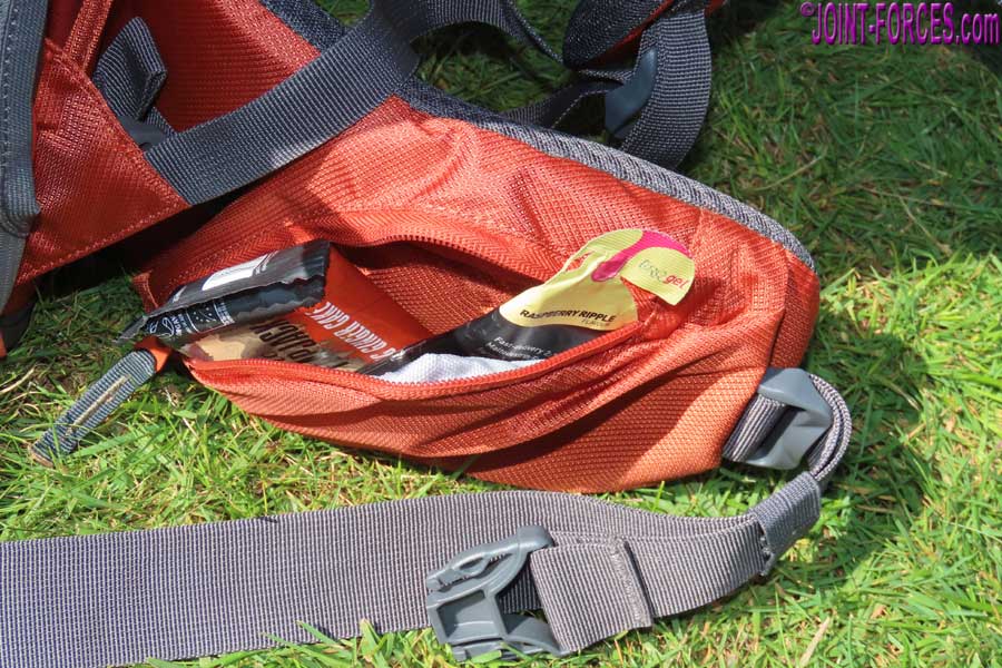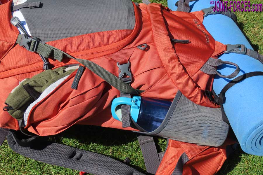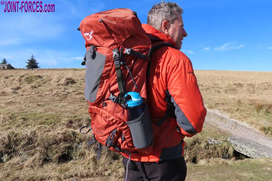 The top cover is fully adjustable and has both external and more secure internal zipped stowage. There are also loops to secure items on top if required, each side has very useful expandable zipped pockets onto which are fitted elasticated pouches for the likes of water bottles or to secure walking poles. There are two side compression straps that can also be used to secure items to the sides. Also on the sides are attachment loops and adjustable pole attachments.