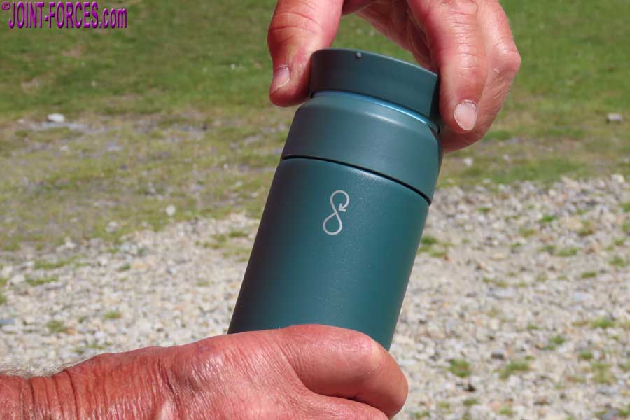The top cap of the Brew Flask is a bit different as it has no mechanism, just a screw element in the cap. Again, a quarter turn allows the fluid to flow when tipped up. The design is such it naturally prevents spillage, so can be left in the open position in a cup holder and be quite safe. The top is a 360° design so you can simply grab and drink without worrying if you have it the right way around. It all works very well.
