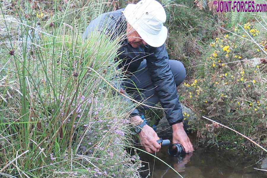 Filling the LIFESYSTEMS Water Filter Bottle from a stream on Dartmoor [© Jean Gormley]