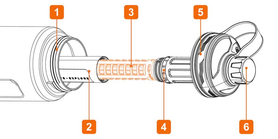 1. BPA-free Bottle – tough copolyester; 2. Filter Straw – tough straw houses the filter cartridge; 3. Filter Cartridge – simple push-fit cartridge will treat up to 600 litres; 4. Life Indicator Ring – for recording the date of next filter change; 5. Screw-on Lid – tough ABS lid with silicone grip; 6. Drinking Cap – screw-top with retaining / carrying loop [© LIFEMARQUE]