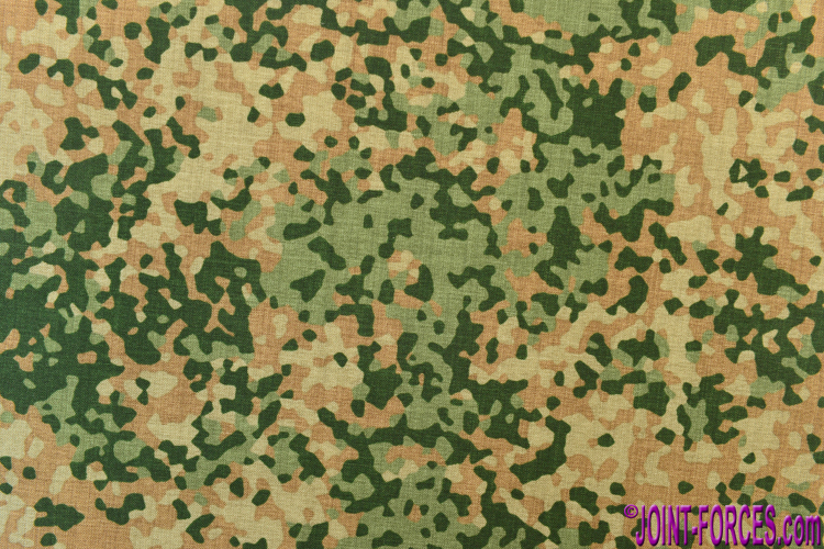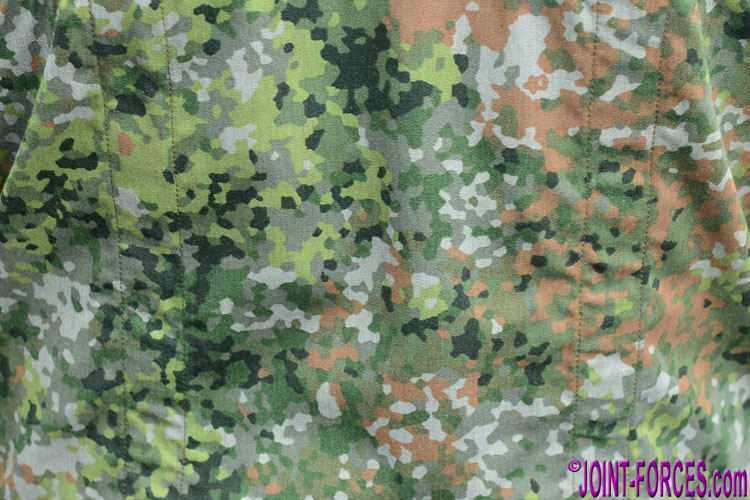 The initial issue of NFP-Green garments was earlier this year, in the form of coveralls for the Dutch tank crews of 4th Company of the combined German-Dutch 414 Tank Battalion (Panzerbataillon 414 or 414 Tankbataljon) who operate the Leopard 2 A6MA2 main battle tank. Last Wednesday, at ILÜ LandOp 2019, Carl spotted a Dutch NCO wearing coveralls in NFP-Green and photographed him from the front for a full-length view and from the rear to obtain a reasonably large swatch of fabric over his back. Close inspection shows that this version is a predominantly verdant seven-colour pattern comprising Light Olive, Olive Drab, Pea Green, Olive Green, Bottle Green, Russet Brown, and a near-black Dark Green. To my eye this camo looks a lot like Flecktarn, the standard German five-colour temperate pattern, but Carl (who unlike myself has seen it up close on troops) assures me the Dutch pattern is much smaller and the overall effect is different.