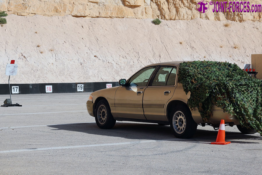 Undertaken in daylight conditions in full event uniform and with a two-minute time limit, TOP SHOT consisted of three stages of engagement: Stage One, for Rifle, consisting of Substages 1A and 1B; Stage Two, for Rifle; and Stage Three, for Pistol. On the command of “Standby, Standby – Go!” from the Senior Event Coordinator time started for both Shooters, who moved first to the Stage 1A engagement zone and occupied the assigned shooting positions on either the left or right side behind a car’s rear bumper / boot (i.e. rear fender / trunk in ‘Chewing Gum English’).
