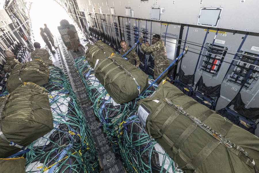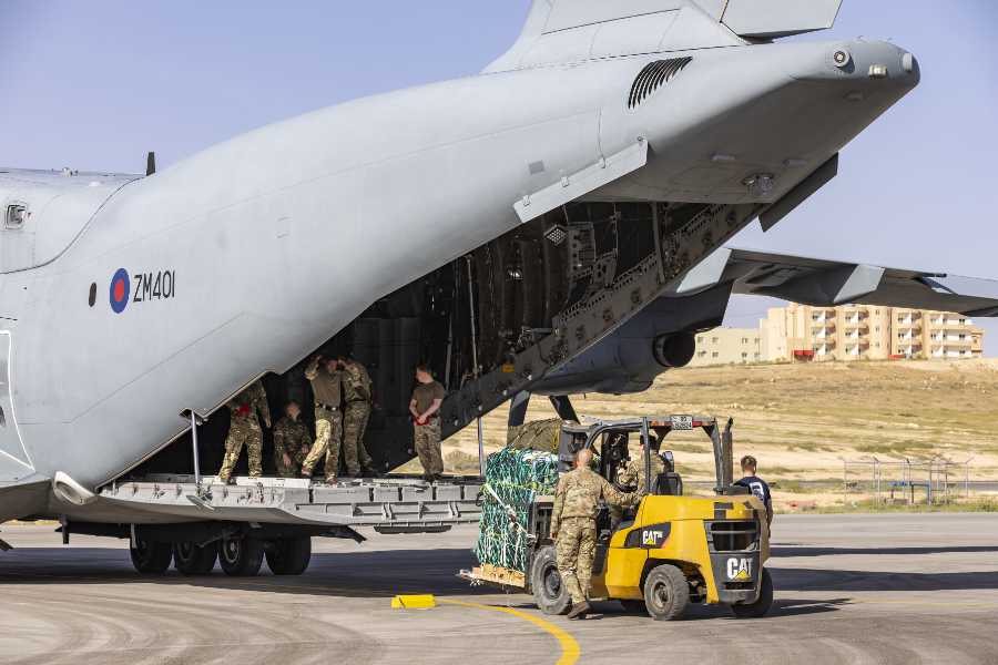 Photo / Video News Release, Whitehall, 02 April 2024: On 01 April 2024, UK Armed Forces distributed Container Delivery Systems (CDS) with Humanitarian Aid as part of the action to address the plight of the Palestinian people. Army personnel from 47 Air Despatch Squadron loaded aid from Jordan and the UK onto an RAF A400M Atlas from RAF Brize Norton. 7000kgs of aid was dropped into Northern Gaza after an assessed reduction in threat to the military mission and risk to civilian life.