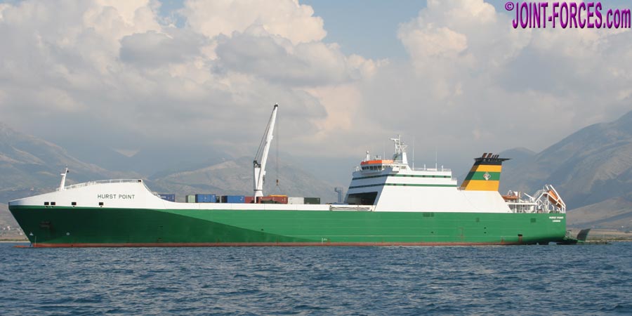 Library image of a Point-class sealift ship (MV Hurst Point) with Mexeflote at stern ramp moored off Pasha Liman Naval Base in Albania [© Bob Morrison]