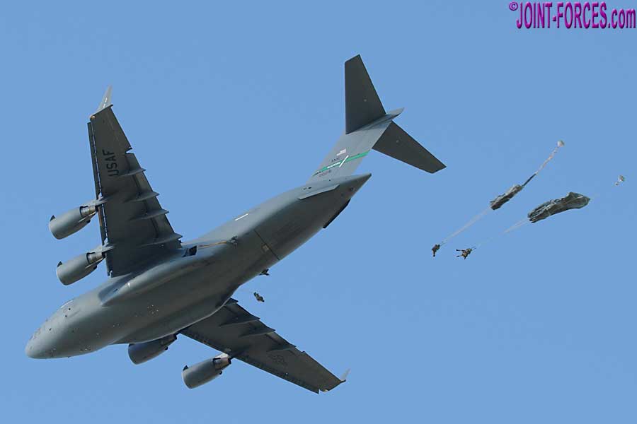 American and British Paratroopers jumping from a USAF C-17 into the Baltic Region in May 2024