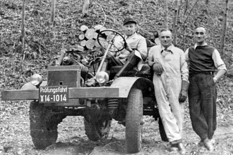 Immediately after the end of the Second World War, Albert Friedrich, technical manager at the gold and silverware factory Erhard & Söhne in Schwäbisch Gmünd and previously head of aircraft engine design at Daimler-Benz, began developing a compact all-wheel drive machine with four equally sized wheels and an engine power of 25hp. It was primarily intended for agricultural use, but also for use as a stationary prime mover and delivery vehicle for the agricultural sector at a speed of up to 50 km/h. These early considerations had to meet the strict criteria of the Morgenthau Plan in the American occupation zone, which was intended to transform Germany into a purely agricultural state.